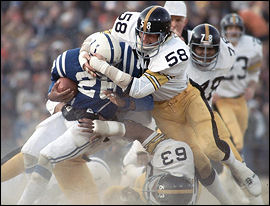 So Bradshaw takes the snap and L.C. Greenwood (nicknamed "Hollywood Bags") mysteriously