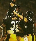 Super Bowl Victory By John Clayton, The Pittsburgh Press Bradshaw won the spelling bee. He wrapped the Dallas defense in a Terrible Towel and hurled it in a perfect spiral to Dallas. Yes, Bradshaw, the ugly duckling, fumbling quarterback of years ago, has blossomed into the beautiful swan (no, not No. 88). Hurray for the good guy. Boo for the heavy, Henderson. "It was like Tom Henderson always talks about -- a happy ending," said Franco Harris after the Steelers became the first team to win three Super Bowls, topping the Cowboys, 35-31, yesterday at the end of the rainbow, Miami's Orange Bowl. By halftime, Bradshaw had destroyed the Super Bowl passing record (Bart Starr's 250-yard performance against Kansas City in Super Bowl I). By the end of the game, he had 17 of 30 completions ![]() "I hope this is the start of something good," said the man who has seen so much bad in his nine years in Pittsburgh. "Maybe I'm learning something. I wasn't going to let one game destroy a good season. I felt we had a good season but I wasn't going to let anyone ruin it for us." Bradshaw played like a man possessed -- possessed with great talent and yes, the Terrible Towell. Towel power prevailed. In the third quarter when Jackie Smith broke free into the endzone, it was time for the towel. When he broke free, I thought it was a touchdown," Steeler Safety Mike Wagner said. "I just said,'Get 'em towell.'" His call worked. Smith, a sure-handed veteran who came out of retirement to join the Cowboys this year, dropped a low Roger Staubach pass in the endzone with the Steelers leading, 21-14. The Cowboys had to settle for a 27-yard Rafael Septien field goal. The towel may have covered the eyes of the officials who did not see Steeler receiver Lynn Swann slip and elbow conerback Bennie Barnes. Barnes, falling down, tripped Swann and drew a 33-yard penalty, setting up Franco Harris' 22-yard run that opened the Steeler lead to 28-17. Oh, the Cowboys did rally from a 35-17 deficit, but surely this fairy tale belongs to Bradshaw, who said,"The game is the most important thing. You have to play the game. You don't win the game with words." Speaking of words, Thomas Henderson will have quite a meal of them this week. His week-long promotion of his own ability and the demotion of the Steelers' talents backfired. ![]() "As you can see, I'm a little sad," said Henderson, his face moistened by a combination of tears and sweat. "I want to keep the competitive spirit in football and any time I don't, I'd get out." It was easy to see that this was Bradshaw's day. Myron Cope talked Chuck Noll into letting Mike Webster wear a Terrible Towel for two plays. Webster kept the towel on the whole day. And Bradshaw wiped his hands on it, grabbed some magic and started completing passes. Dallas took the opening kickoff and raced into Steeler territory on three Tony Dorsett runs for 38 yards. But the Cowboys abandoned the run and spoiled the offense. Drew Pearson fumbled a handoff from Dorsett on an end around double reverse and John Banaszak recovered. ![]() Bradshaw then marched the Steelers upfield 53 yards in seven plays for a touchdown, lobbing a 28-yard strike to John Stallworth, one of two TD catches for Stallworth. "On the first touchdown, we exploited a weakness we noticed on film," Stallworth said. "We saw the corners do some jumping. I took a slant, went back to the outside and Bradshaw (who pumped once) lobbed the ball." But as Bradshaw was grabbing the spotlight yesterday, he also assumed the role of goat. He later overthrew Stallworth and linebacker D.D. Lewis intercepted a pass to end a promising drive. On the next possession, Bradshaw, chased by Ed "Too Tall" Jones and Harvey Martin, lost the ball and Jones recovered, giving Dallas possession at on the Steeler 41. On the last play of the first quarter, Staubach hit Tony Hill for a 26-yard score. Safety Donnie Shell jammed Hill too closely at the line and fell behind. It was the only touchdown scored against the Steelers in the first quarter this season. The first half was filled with exciting plays as both teams gambled on defense. With the score tied 7-7, Bradshaw had the ball knocked loose by his own man at the Steeler 48, scooped it back up, and was pressured and grabbed by both Henderson and Mike Hegman, who stole the ball and ran 37 yards for a touchdown. The Cowboys took a 14-7 lead, and Bradshaw bruised his left shoulder on the play, but soon returned to action. (Ed. note: I've got a broadcast videotape of this game, and the coaches were giving Bradshaw smelling salts on the sideline during the commercial time-out. He was pretty roughed up). On 3rd and 5 from his own 25, Bradshaw passed to Stallworth near the sidelines at the Steeler 35 and Stallworth raced through the Cowboy defense for a 75-yard score, tying a Super Bowl record. (Ed. note: Lynn Swann made a great block on this play, taking out the only man in position to tackle Stallworth). A Mel Blount interception gave the ball back to Bradshaw at the Steeler 44 with 1:41 remaining in the half. Bradshaw worked the 2-minute drill like a master. He hit Swann on 29 and 21-yard passes that moved the Steelers to the Cowboys 16. Three plays later, he rolled right and lofted a beautiful high pass into the endzone that Rocky Blier plucked from the air for a 7-yard touchdown to give the Steelers a 21-14 halftime lead. "I think the Steelers and the Cowboys have played the two most exciting games ever to be played in the Super Bowl," Blier said. "I give credit to Dallas because they didn't quit today." In the first half, Bradshaw had picked apart the Dallas secondary for 253 yards and three touchdowns while Dallas had only 102 total yards. "I was surprised at how relaxed I was," Bradshaw said. "I was able to stay relaxed and not worry so much." ![]() Dallas DE "Too Tall" Jones missed a few plays because somebody stepped on his ankle. Steeler guard Gerry Mullins pinched a nerve in his neck and had the wind knocked out o