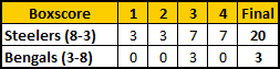 Blitzburgh forces 3 Jeff Blake fumbles on 4 sacks with Greg Lloyd and Kevin Henry each recording a sack and a fumble recovery. Facing cold, snowy conditions, Pittsburgh gains more yards on the ground than through the air with Jerome Bettis rushing 25 times for 101 yds and George Jones adding 64 yds on 8 carries. Kordell Stewart throws for two TDs and Yancey Thigpen catches 5 passes for 101 yds and a TD as the Steelers earn their 7th win in 8 games.