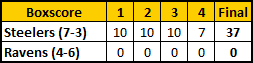 Kordell Stewart runs for a TD and throws for another (52 yds to Thigpen) as the Steelers take advantage of 7 turnovers (6 in the first-half alone) for a 37-0 Sunday Night romp over the Ravens. Jerome Bettis runs 24 times for 114 yards and a TD, recording his 4th straight 100-yard game and 7th of the season, and Yancey Thigpen shines with 6 catches for 130 yds and a TD. Vinny Testaverde and Eric Zeier combine for 4 INTs and the Ravens also fumble 5 times, losing 3 to the Steelers as the Ravens muster only 172 yds of total offense.