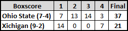 2004 Ohio State vs Xichigan ![]() Ohio State comes out swinging early when Troy Smith escapes pressure on 3rd-and-12 and uncorks a 68 yd TD to Anthony Gonzalez. Xichigan answers with a Chad Henne fade to Jason Avant, then grabs the lead on a Mike Hart 1 yd plunge. OSU answers from deep in its own end, ripping off a 99 yd response drive capped by Smith’s 2 yd keeper, then Nugent adds a pair of FGs to send the Buckeyes to halftime up 20-14. The 3rd quarter turns on special teams. Ted Ginn Jr. fields a punt, breaks multiple tackles, breaks outside and hits the jets for an electric 82 yd TD return. The Buckeyes force an punt, and on their ensuing drive, Smith rips off a back-breaking 46 yd scramble on 3rd-and-8 to keep a long drive alive, then zips a 12 yd TD to Santonio Holmes to cap the back-breaking 97 yd drive. Xichigan threatens to score late, but Youboty picks off Henne at the 1. Braylon Edwards scores a 38 yd TD in garbage time, but the Buckeyes close it with another Nugent FG and a late Nate Salley INT. Red shirt freshmen Troy Smith finishes the game with 241 yds passing, 145 yds rushing, and 3 TDs. |