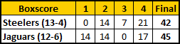 2017 Steelers vs Jaguars Divisional Playoff ![]() A disgusting, unforgiveable playoff loss to an inferior team. After being blown out by Jacksonville in the regular season, the Steelers had every reason to be prepared for this game. Instead, Blake friggin' Bortles hangs 45 points on them at home. The Steelers sleepwalk through an error filled 1st half and trail 21-0 barely three minutes into the 2nd. Ben throws for 469 yds and 5 TDs, but an early INT deep in Pittsburgh territory sets up a Fournette TD, and a strip sack late in the half is scooped up and returned 50 yds for a TD. To his credit, Ben keeps fighting and claws back to within one score 4 separate times, but defense contributes nothing. No sacks, no turnovers, a clean pocket for Bortles, and no answer for Fournette, who grinds them for 109 yds and 3 TDs. Mike Tomlin and his staff are thoroughly outcoached and fail to adjust on either side of the ball. Thus, a 13-win team with scary talent and every expectation of contending for a Super Bowl goes one-and-done in humiliating fashion. For me, this game was the last straw... proof that Mike Tomlin is no longer capable of winning a championship, despite fielding a championship-caliber roster. |