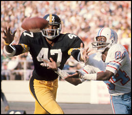 The teams trade punts until Mel Blount makes a huge INT late in first half at the Steeler 40 (forced by pressure from Joe Greene) and returns it all the way to the Houston 13. After a pair of penalties, Swann runs a perfect down-and-in pattern, leaps in front of a trio of flatfooted Oiler defenders to make the catch, sidestepping them as he glides into the end zone to complete a 21-yd TD pass.