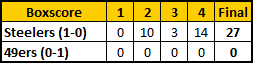 The Steelers win their 4th straight, chalk up their 3rd straight shutout and add to their string of 13 straight quarters without a point and 17 straight quarters without a TD. The Steel Curtain holds KC's #2-ranked offense to a paltry 34 yds rushing and forces 6 turnovers - 4 INTs and 2 fumbles.