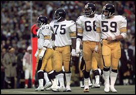 The Steel Curtain bankrupts the hated Raiders in perhaps the most pivotal game in team history. Pittsburgh limits Oakland's #1-ranked offense to a paltry 29 yards rushing in 21 attempts (a puny 1.4 yd avg) and forcing Ken Stabler into 3 crippling INTs, despite a career game by Cliff Branch (9 catches, 186 yds).
